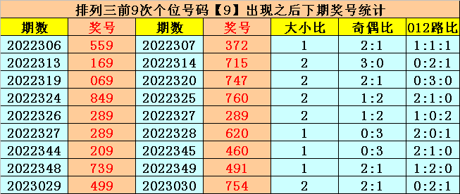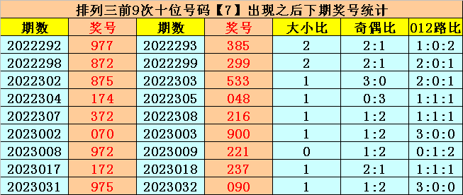 在十位前9次出现号码7后,其下期奖号离别开出:8-9-3-4-1-0-2-3-9,其中奖号个数012路比是5:2:2,奇偶比是5:4,大小比是3:6。