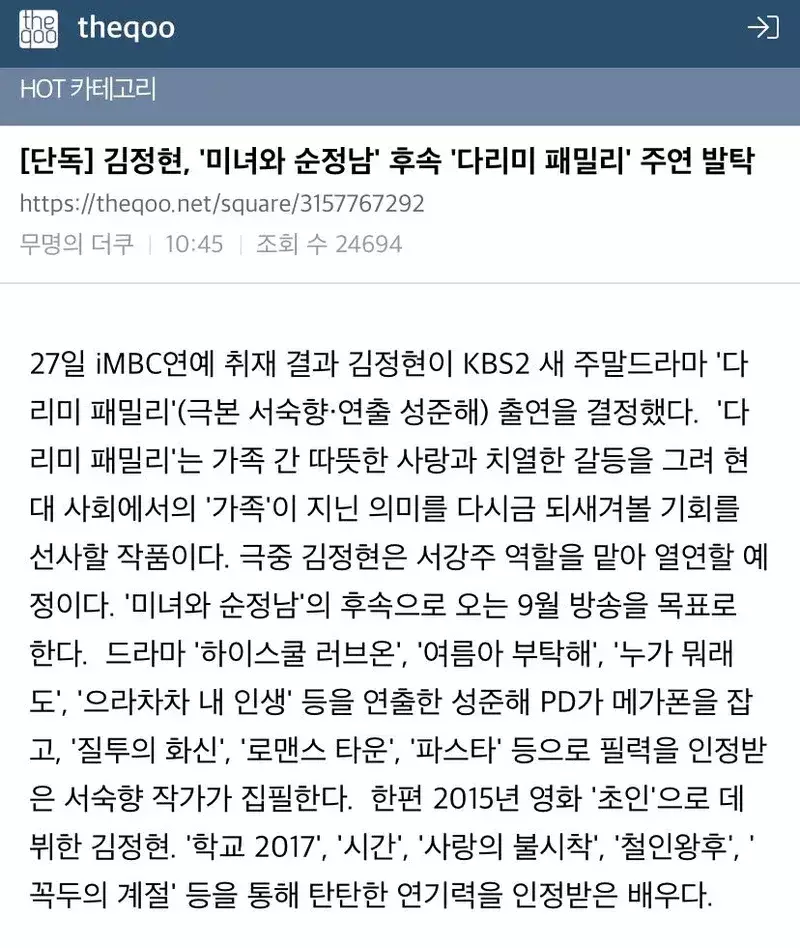 但是在经由格调争议与前女友的风云后,金正贤近日传出将接下KBS戏剧《熨斗家眷》(暂译),而这亦然他在风云后接的第二部小萤幕作品,但不虞却引起了很多网友的非议。